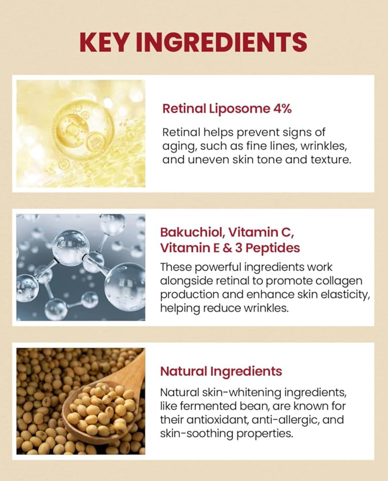 Cette crème contour des yeux, enrichie à 4% de rétinal liposomé et d'extrait de ferment de soja (Lactobacillus/Soybean Ferment Extract), offre une action anti-âge globale et un effet illuminateur, tout en améliorant la texture de la peau et en réduisant visiblement l'apparence des rides, avec un minimum d'irritations.