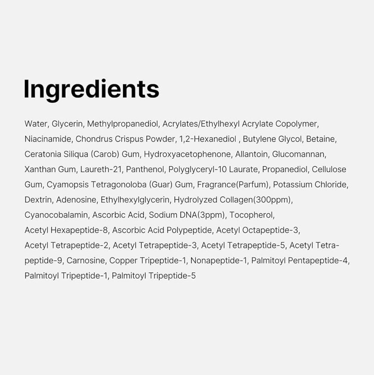 Le PDRN Prism issu du saumon et le collagène hydrolysé à faible molécule offrent une hydratation efficace, renforcent la barrière cutanée et améliorent l'élasticité de la peau.